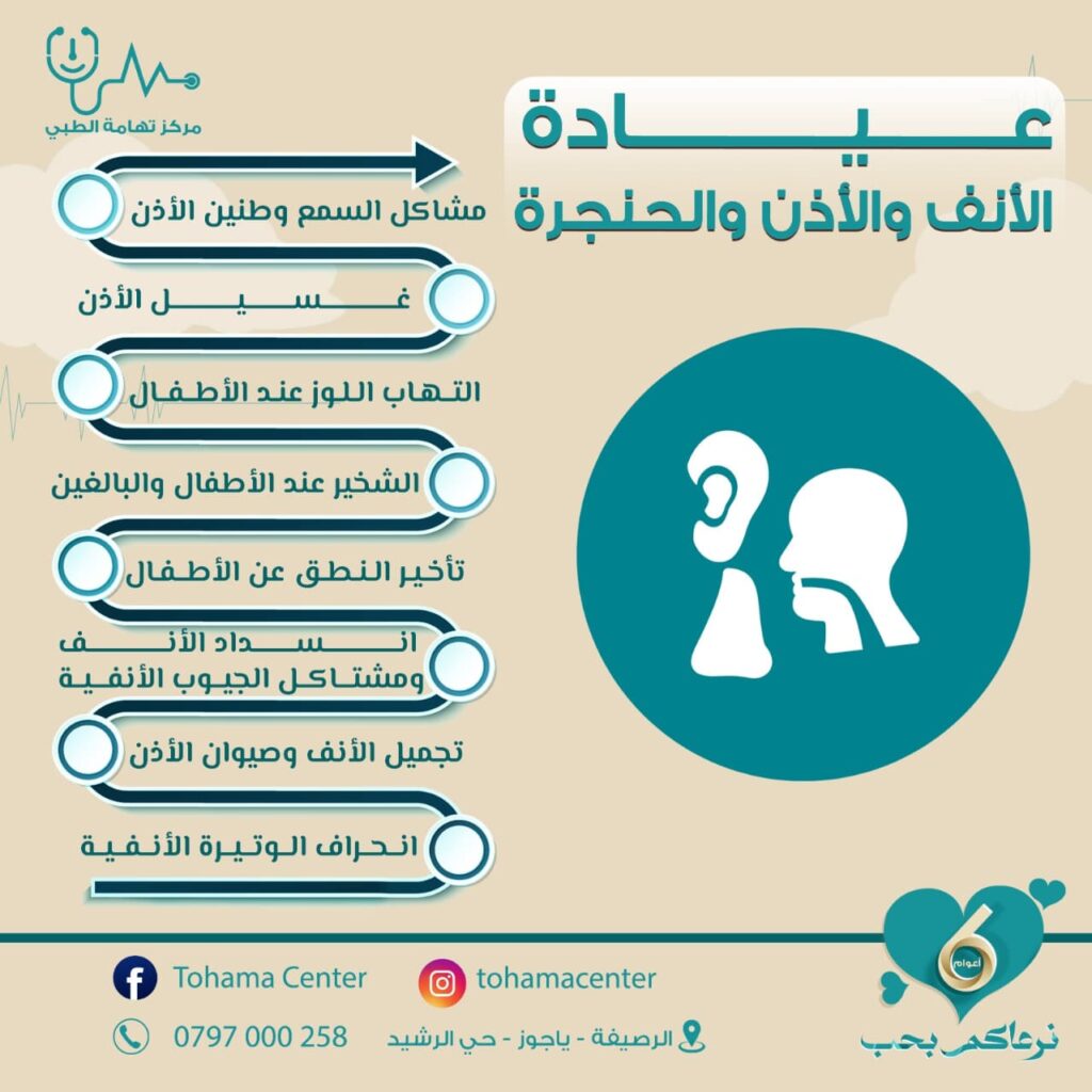 تُقدّم عياده الأنف والاذن والحنجرة في مركز تهامة الطبي رعاية طبية متكاملة وشاملة للمرضى، تشمل التشخيص الدقيق والعلاج الفعّال والمتابعة المستمرة، بإشراف كادر طبي مؤهل يمتلك الخبرة والكفاءة في التعامل مع مختلف الحالات اليومية والطارئة، وذلك في بيئة آمنة ومجهزة بأحدث الأجهزة الطبية، حرصًا على راحة المرضى وسلامتهم وجودة الخدمات المقدّمة.